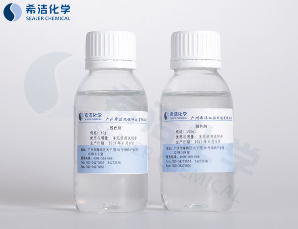 脫色劑是集脫色、絮凝、分離等多種功能于一身的有機(jī)分子合物,該產(chǎn)品特有的陽離子基團(tuán)與廢水著色物質(zhì)的陰離子基團(tuán)相互作用而成為難溶性鹽,用量小,脫色率,不再回色。對廢水的脫色率大于95%,COD的去除率在50%~70%之間,達(dá)到雙重功!